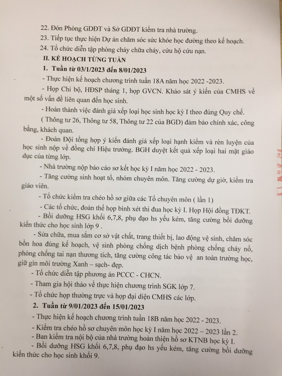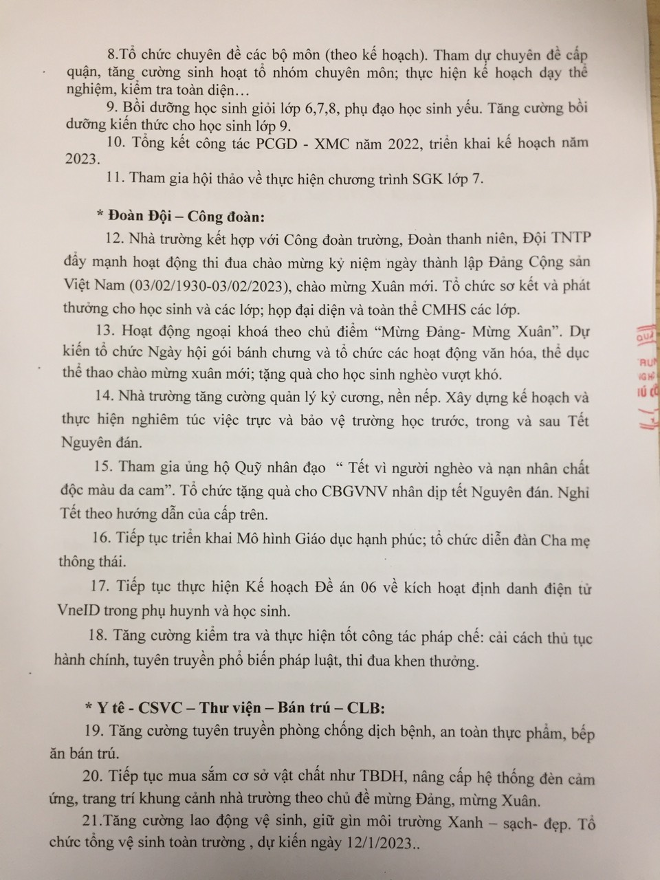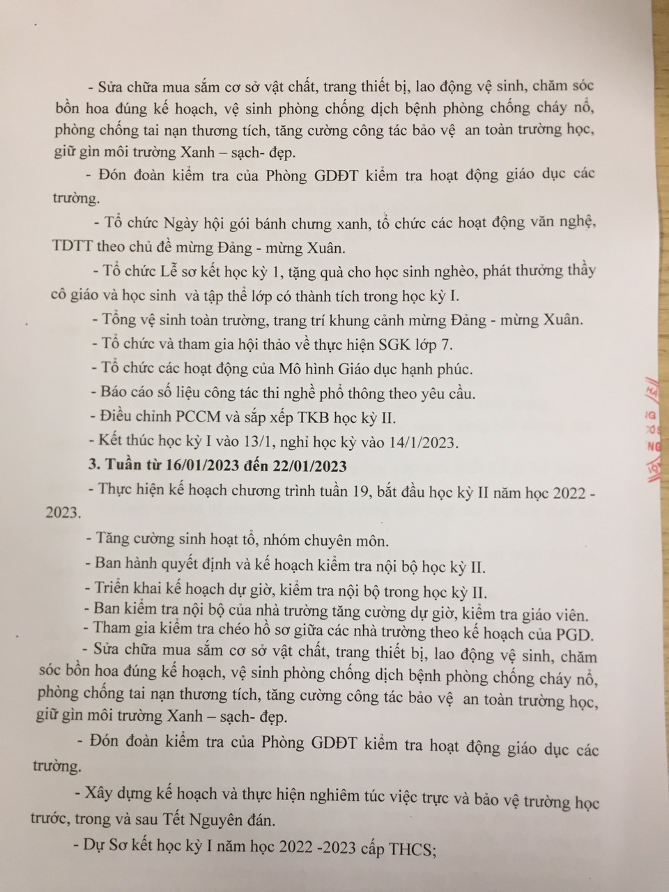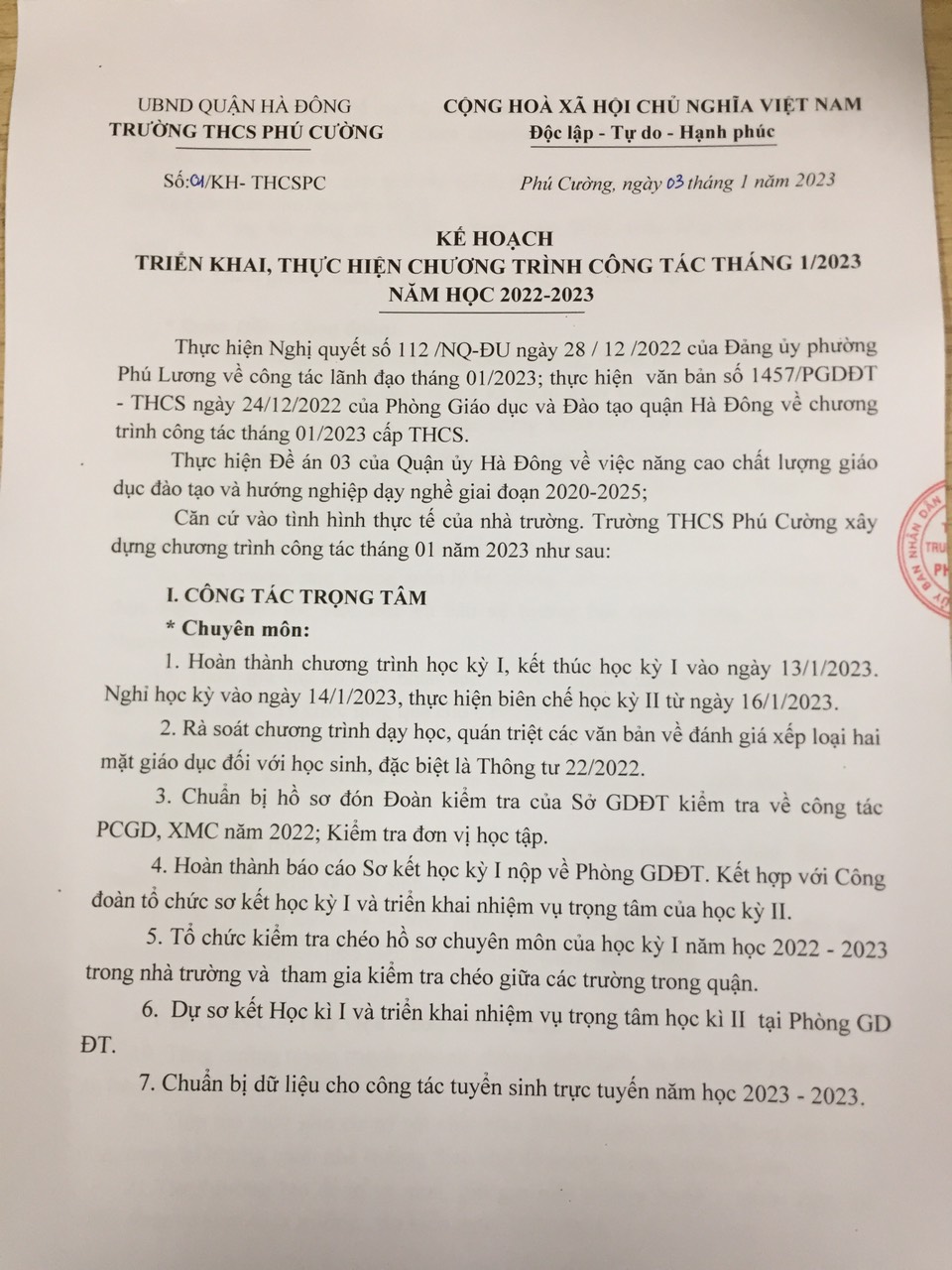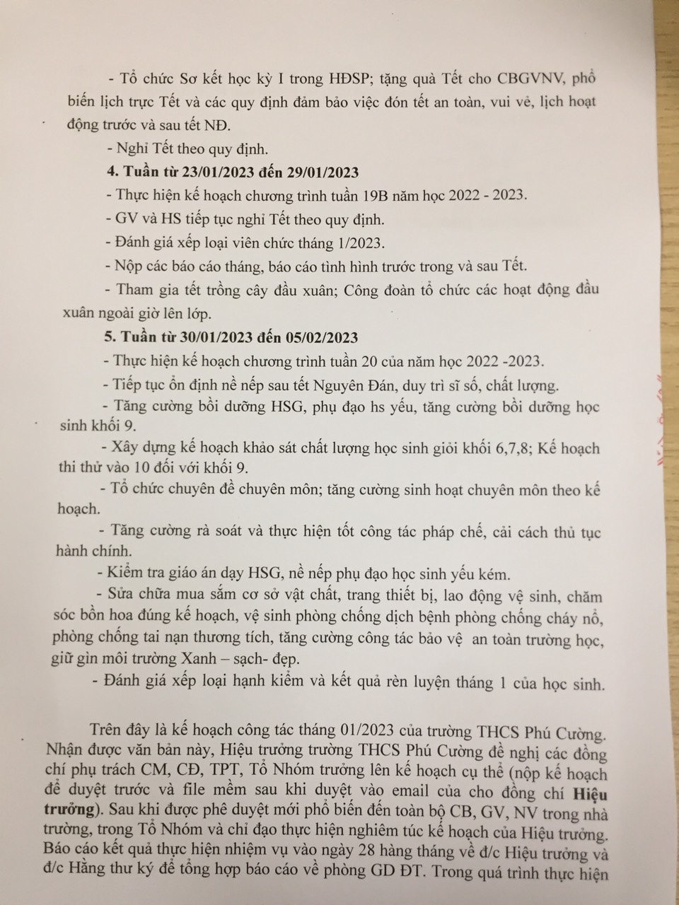 Chương trình công tác tháng 1 trường THCS Phú Cường năm học 2022-2023
