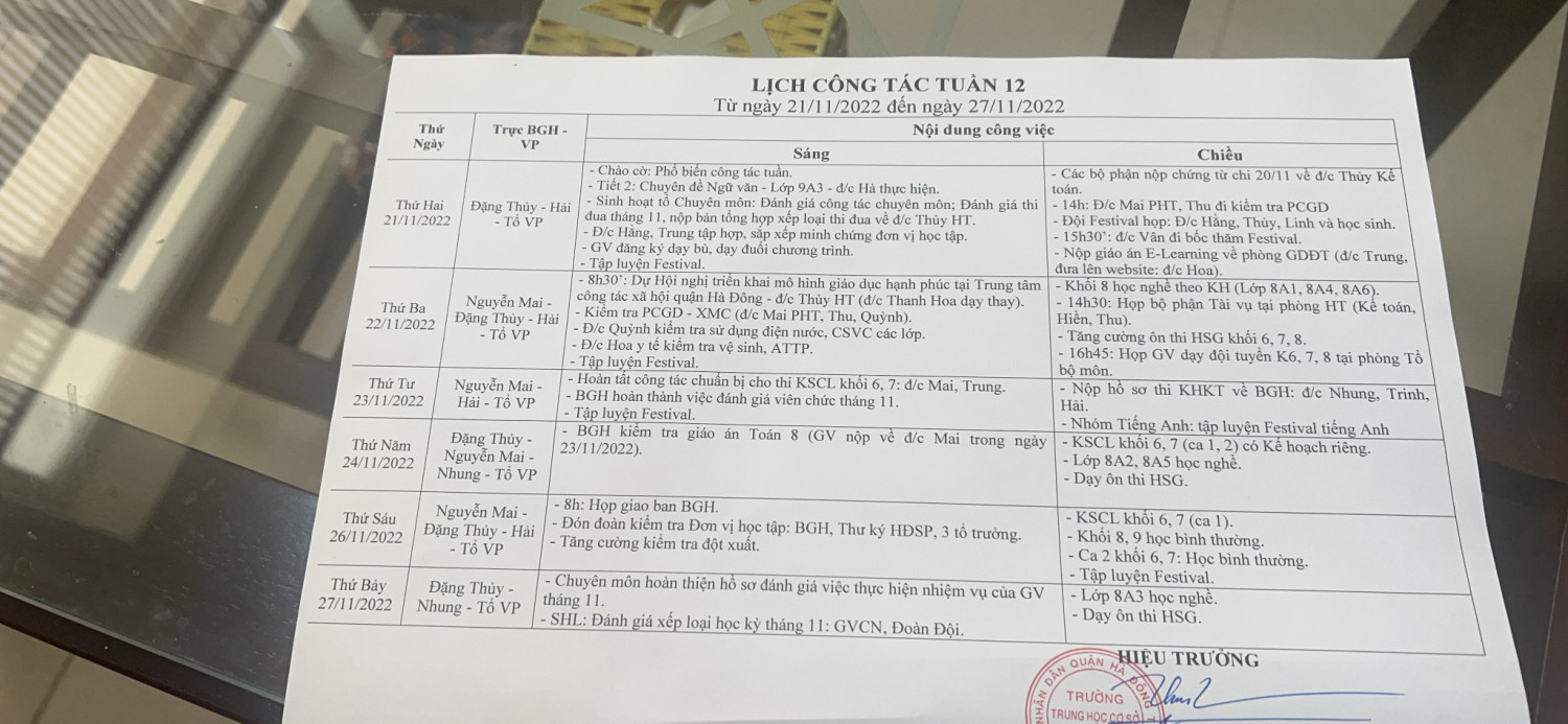 LỊCH CÔNG TÁC TUẦN 12