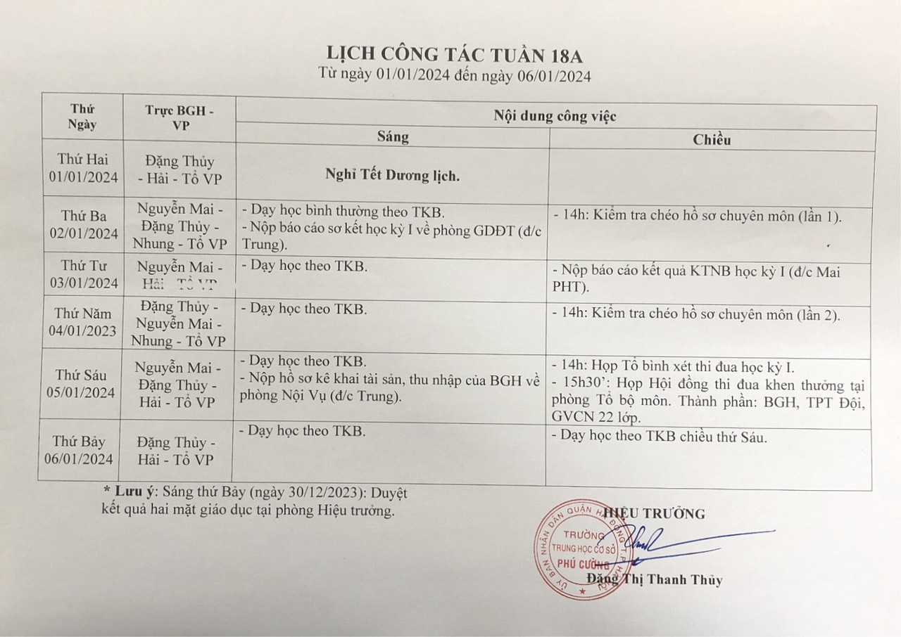 LỊCH CÔNG TÁC TUẦN 18A NĂM HỌC 2023-2024