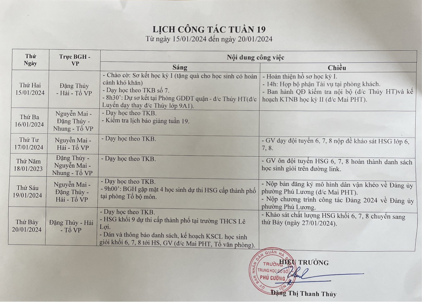 LỊCH CÔNG TÁC TUẦN 19 NĂM HỌC 2023-2024