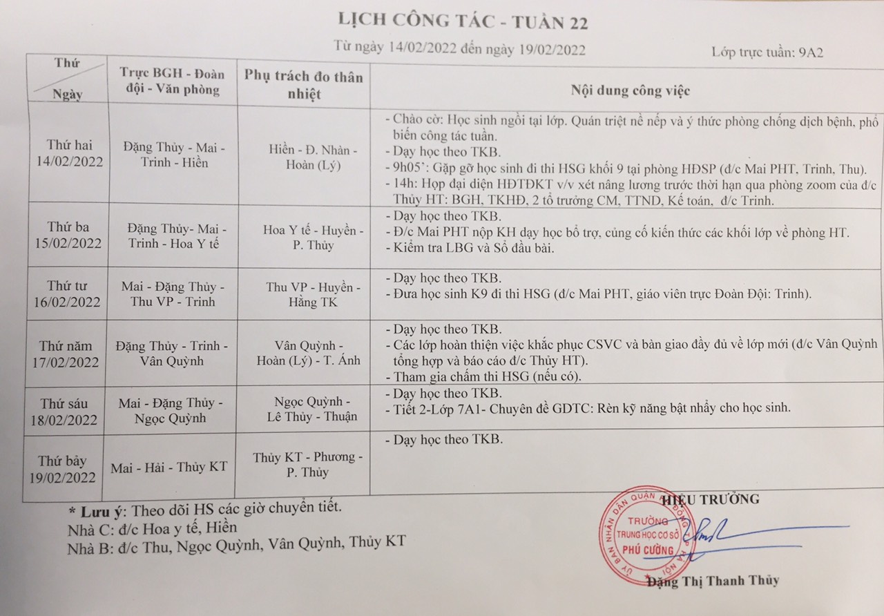 Lịch công tác tuần 22 năm học 2021-2022