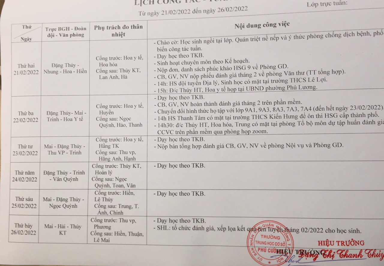 Lịch công tác tuần 23 năm học 2021-2022