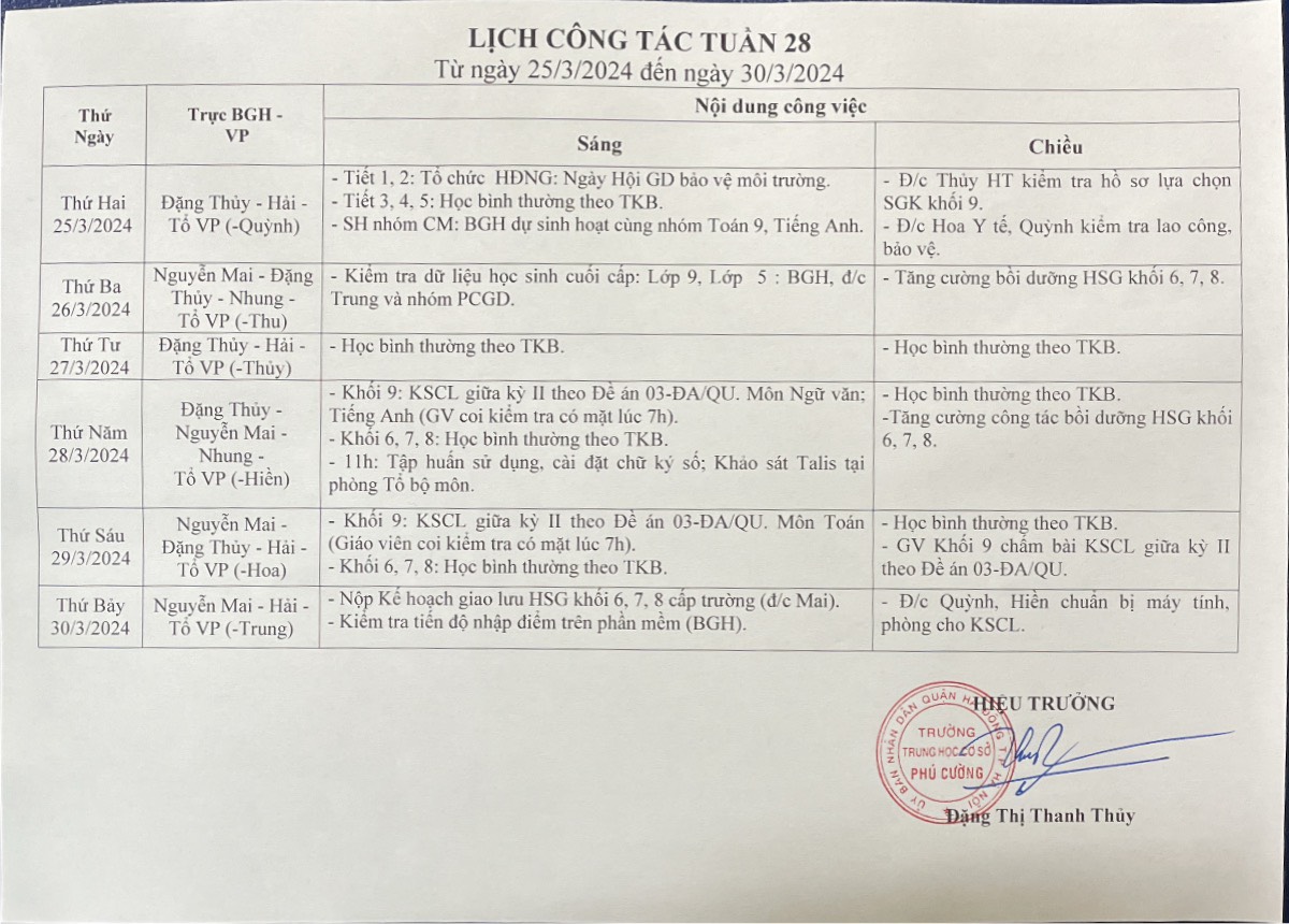 LỊCH CÔNG TÁC TUẦN 28 NĂM HỌC 2023-2024