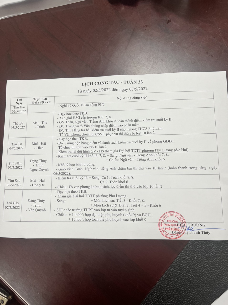 LỊCH CÔNG TÁC TUẦN 33 NĂM HỌC 2021-2022