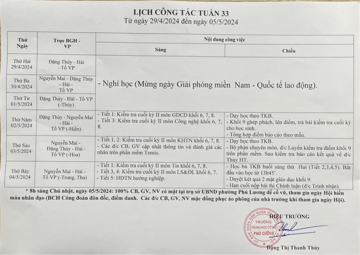 LỊCH CÔNG TÁC TUẦN 33 NĂM HỌC 2023-2024