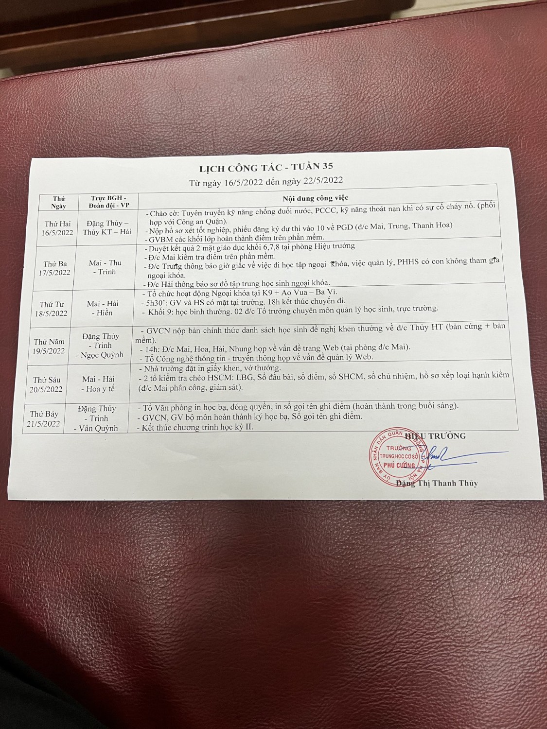 LỊCH CÔNG TÁC TUẦN 35 NĂM HỌC 2021-2022