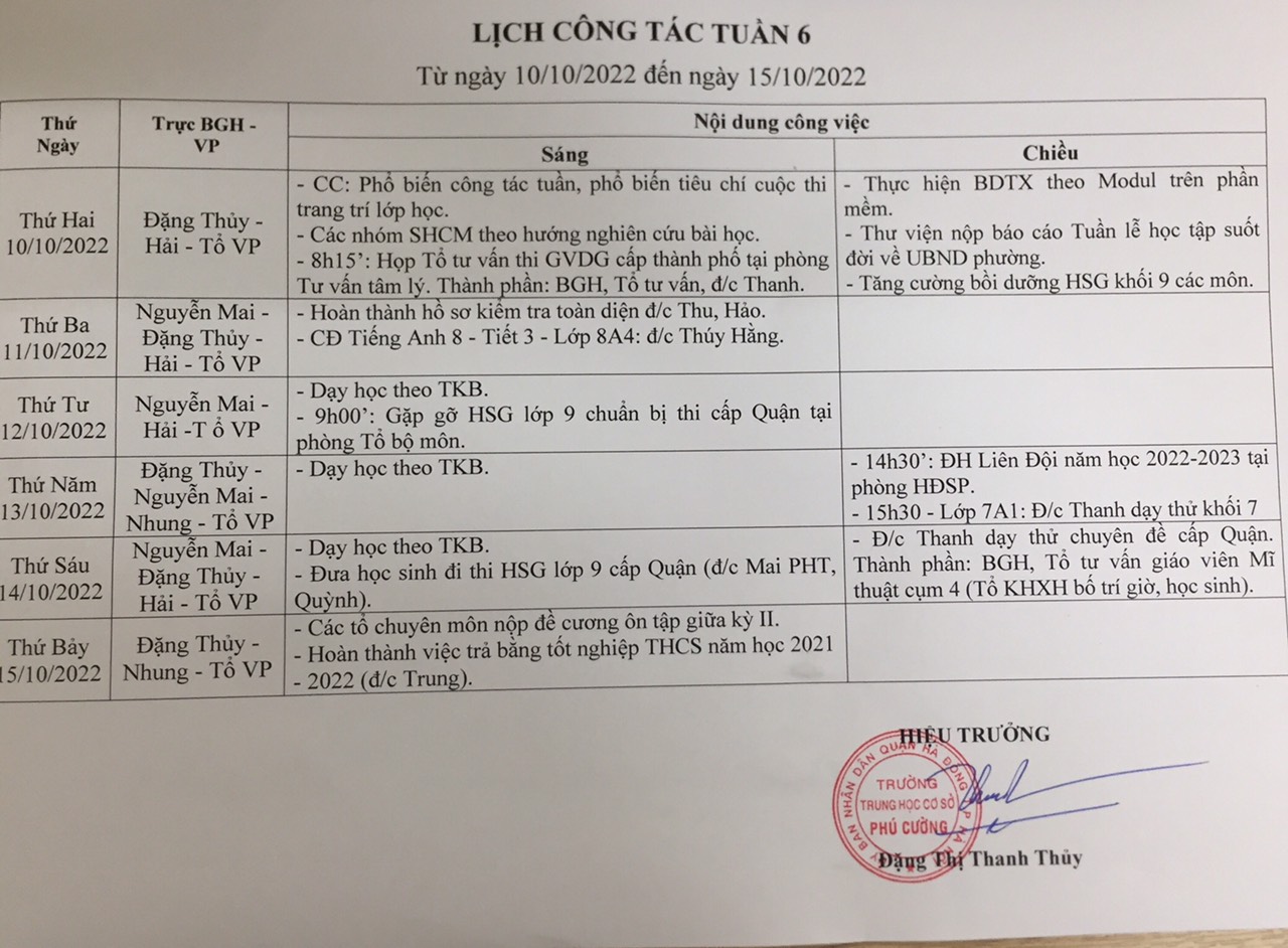 Lịch công tác tuần 6 năm học 2022-2023