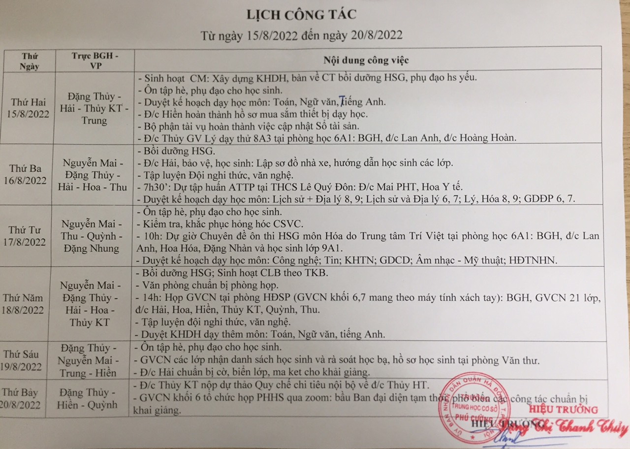 Lịch công tác tuần từ 15/8-21/8/2022
