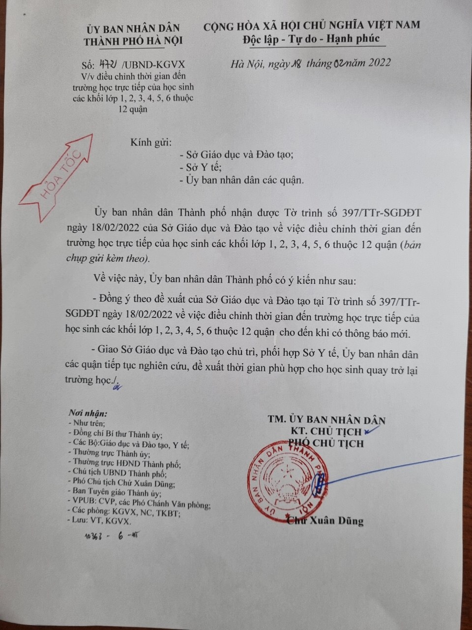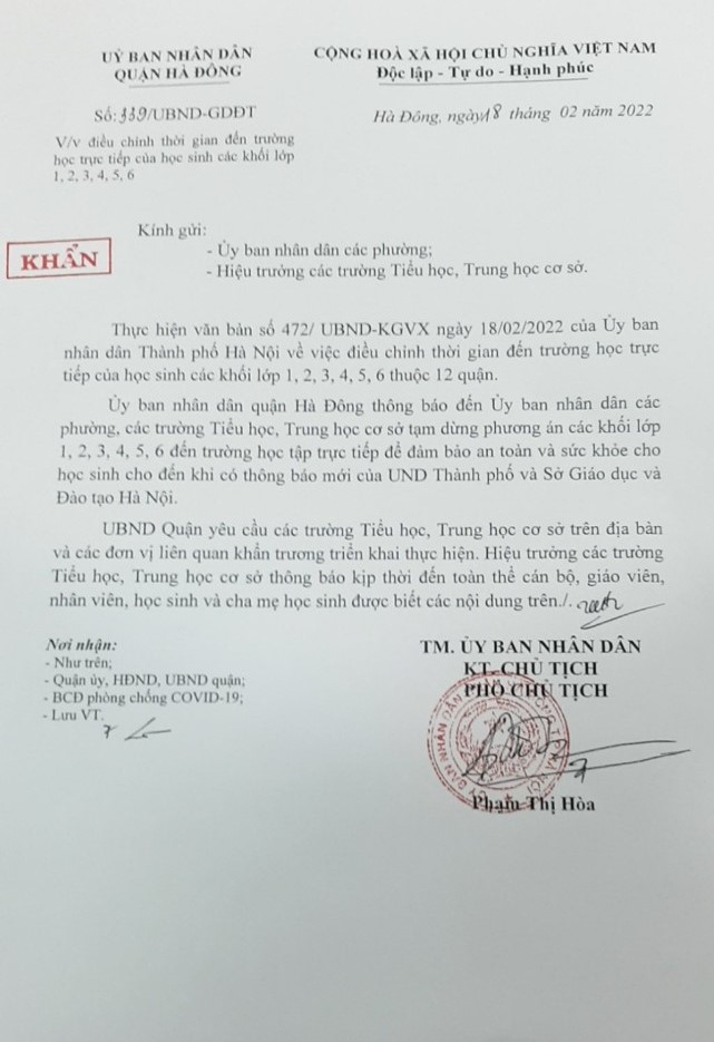 Công văn của UBND thành phố Hà Nội và UBND quận Hà Đông về việc điều chỉnh thời gian đến trường của học sinh khối lớp từ 1-6