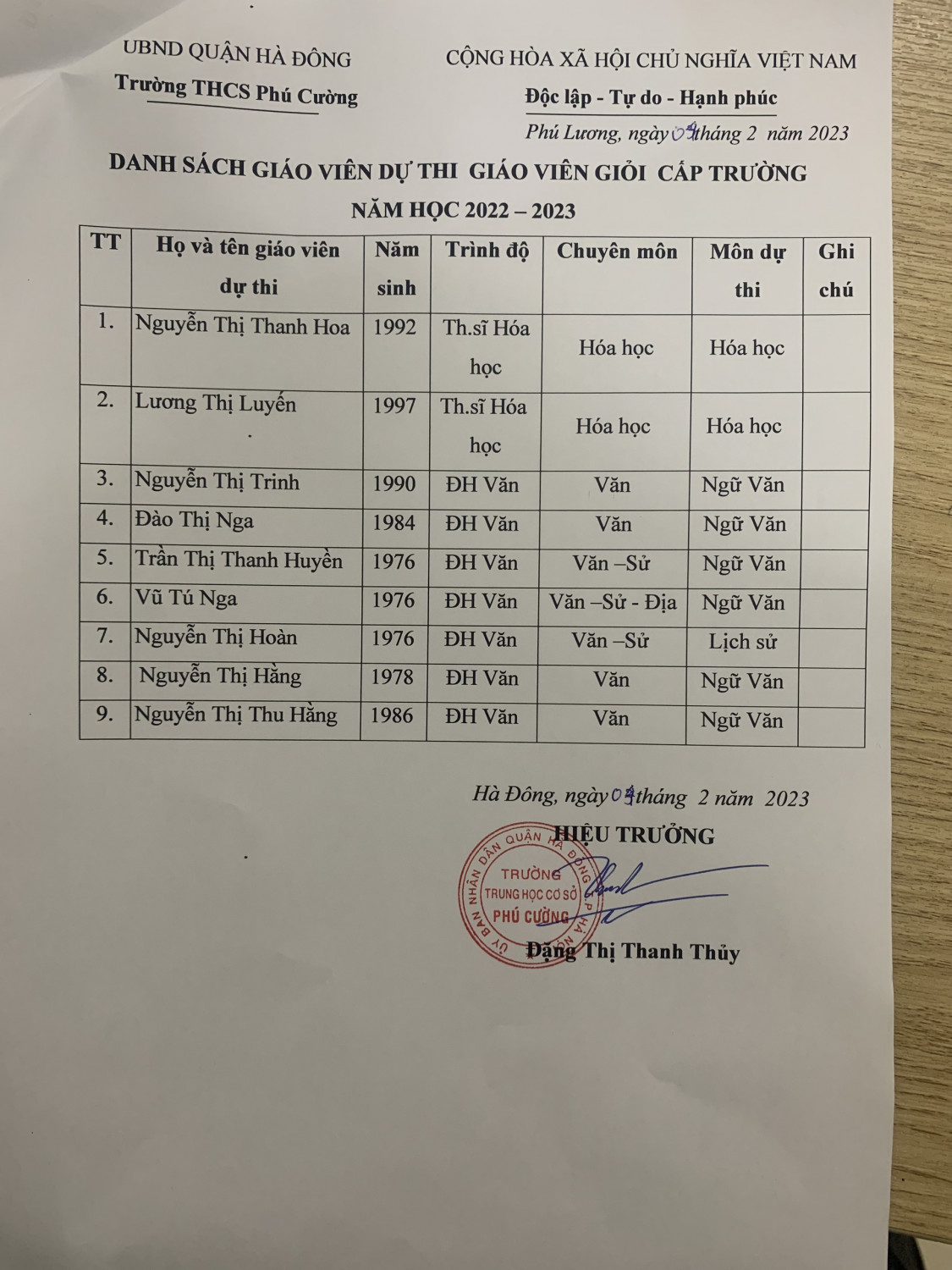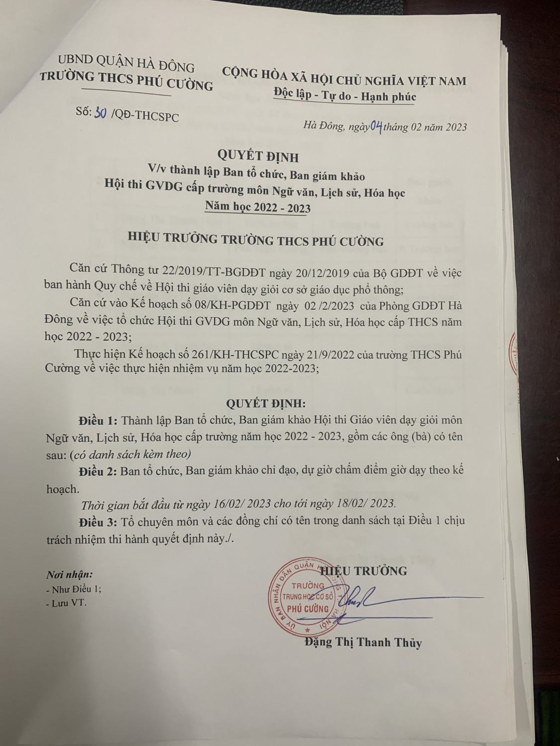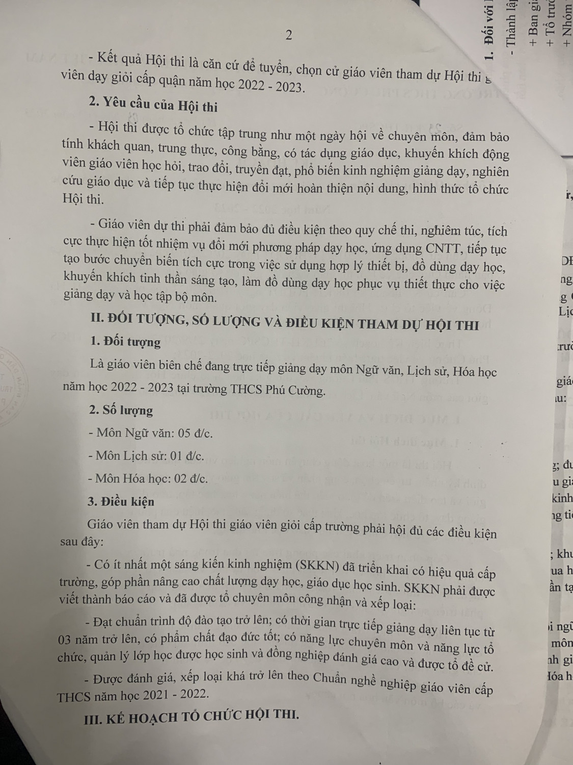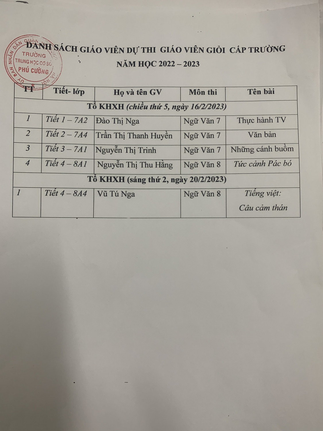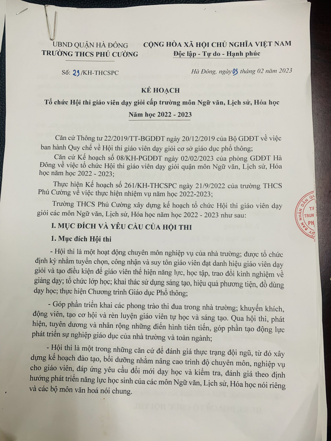 Kế hoạch thi Giáo viên dạy giỏi cấp trường năm học 2022-2023 môn Lịch sử, Hóa học, Ngữ Văn