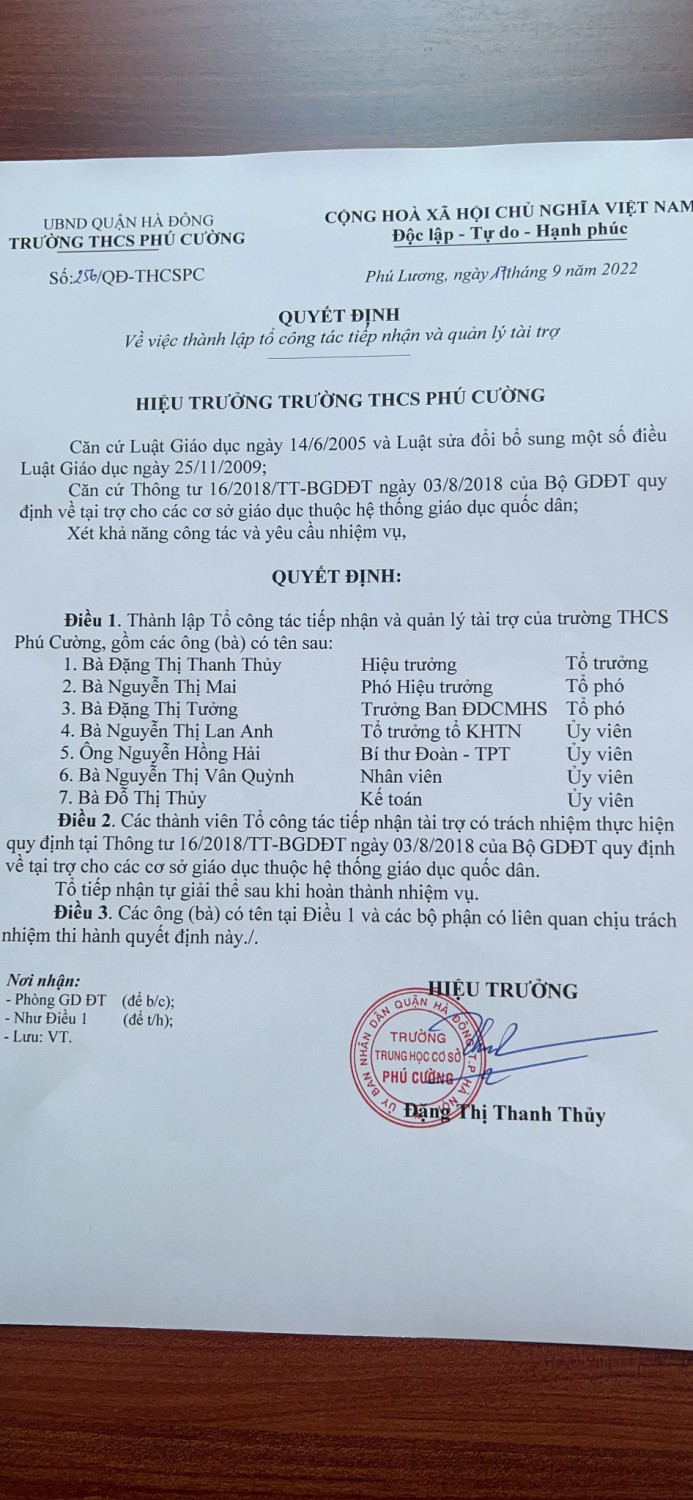 Quyết định thành lập tổ công tác tiếp nhận và quản lí tài trợ trường THCS Phú Cường