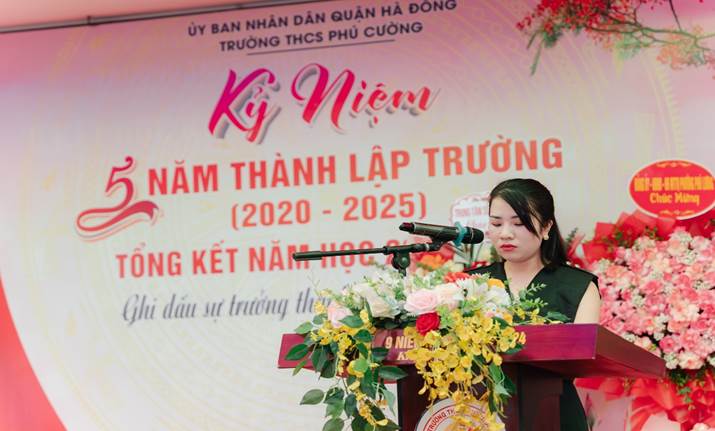 Khép lại bài phát biểu, cô đã dành tặng toàn thể đại biểu, thầy cô và các em học sinh bài thơ “Trường THCS Phú Cường – Nơi thắp sáng những tiềm năng” do cô sáng tác, với những câu thơ mở đầu chan chứa niềm tự hào và hy vọng: