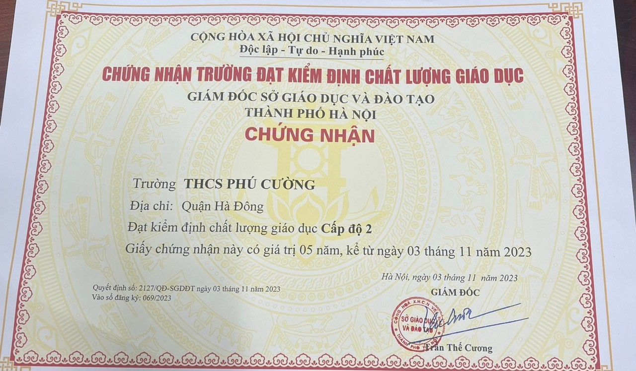 QUYẾT ĐỊNH CÔNG NHẬN TRƯỜNG THCS PHÚ CƯỜNG - QUẬN HÀ ĐÔNG ĐẠT KIỂM ĐỊNH CHẤT LƯỢNG CẤP ĐỘ 2 VÀ ĐẠT CHUẨN QUỐC GIA MỨC ĐỘ 1.
